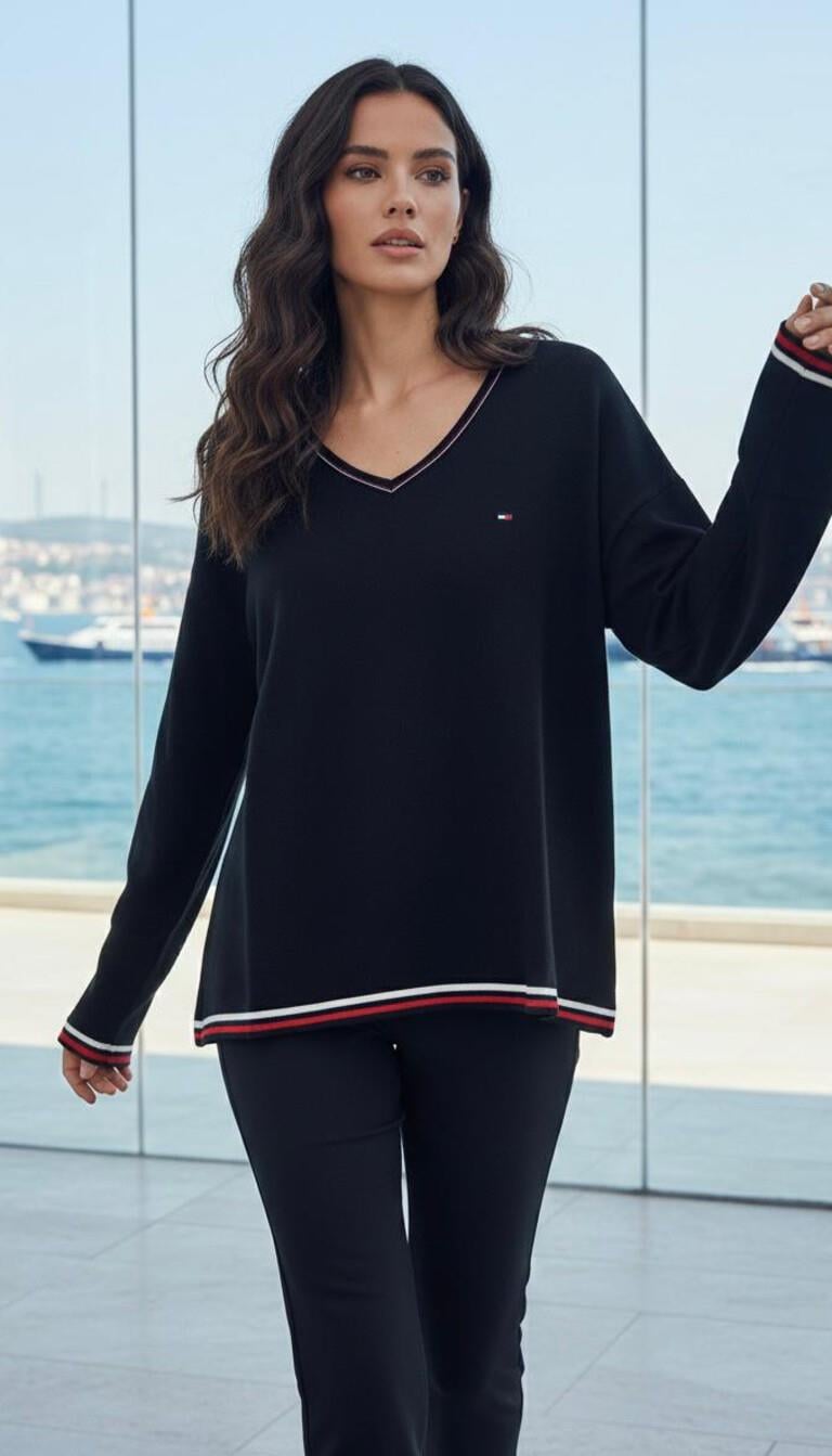 - Klasik çizgili deseniyle şıklığı ve sadeliği bir arada sunan V yaka oversize siyah triko.;